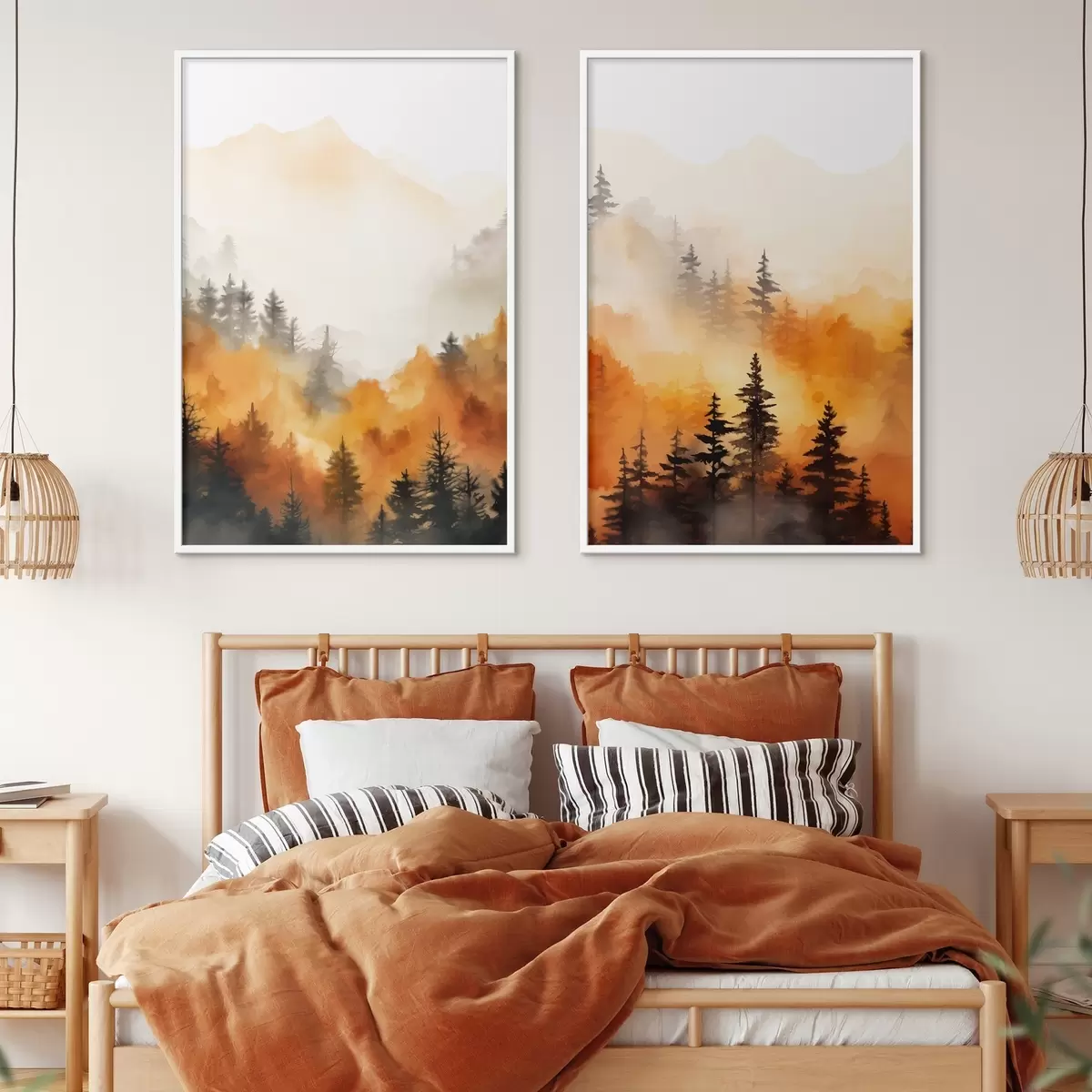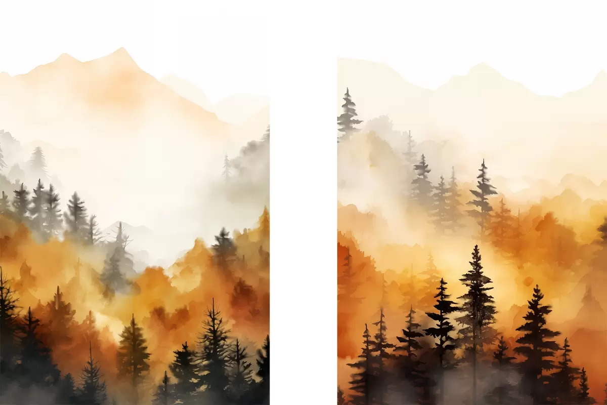 Poster Peinture aquarelle d'un paysage imitant une forêt avec de grands pins et des montagnes en arrière-plan Nr d00519