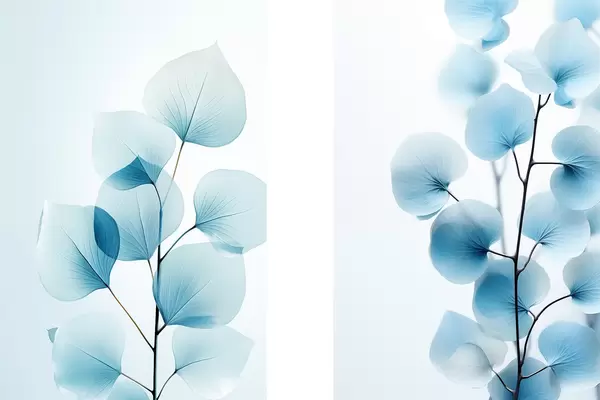 Poster Branche avec des feuilles bleues translucides, veines délicates visibles, composition légère et calme, esthétique minimaliste d00522