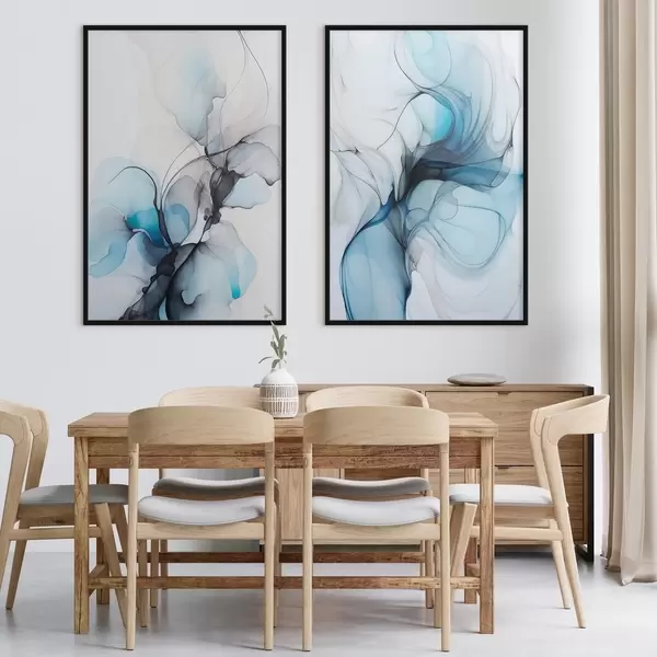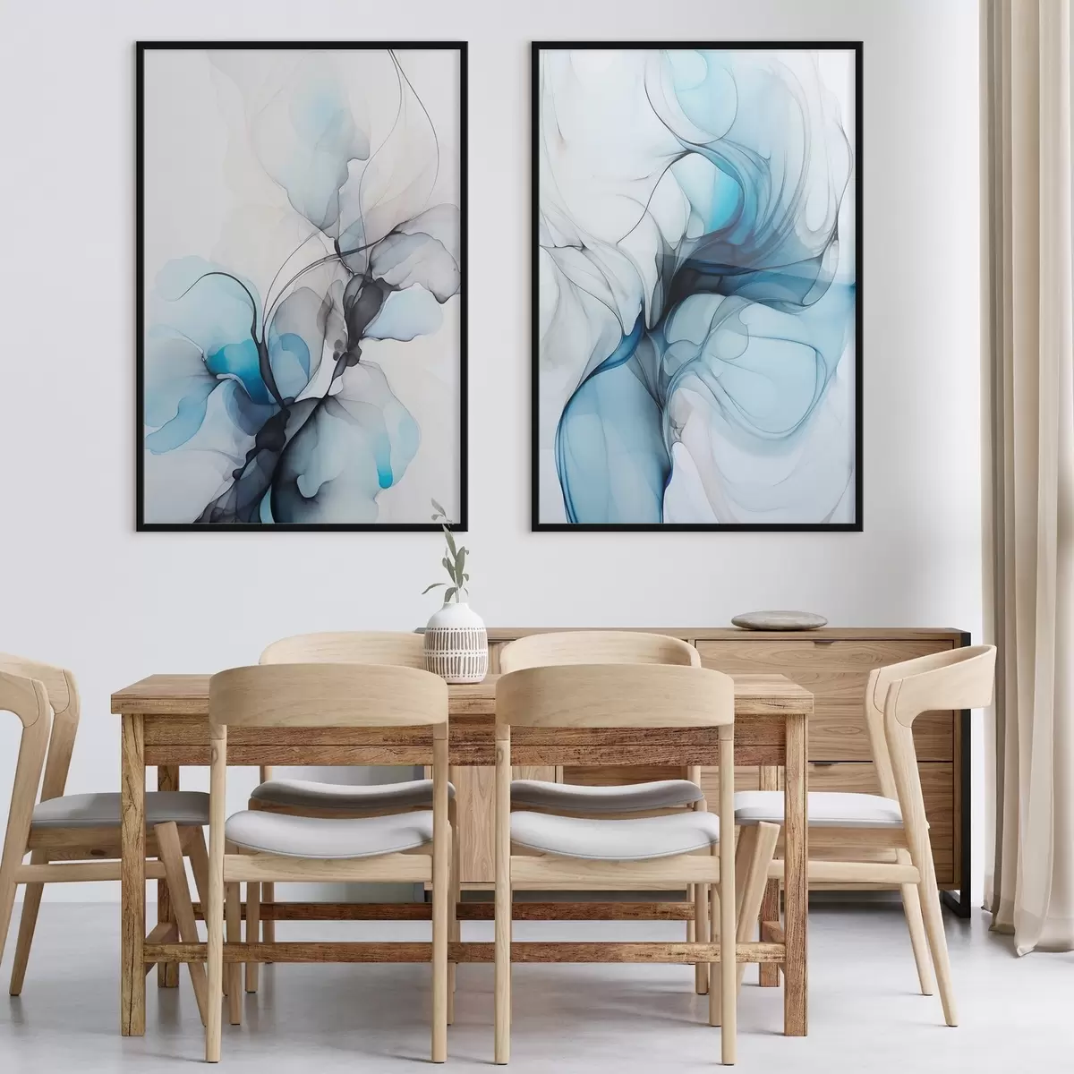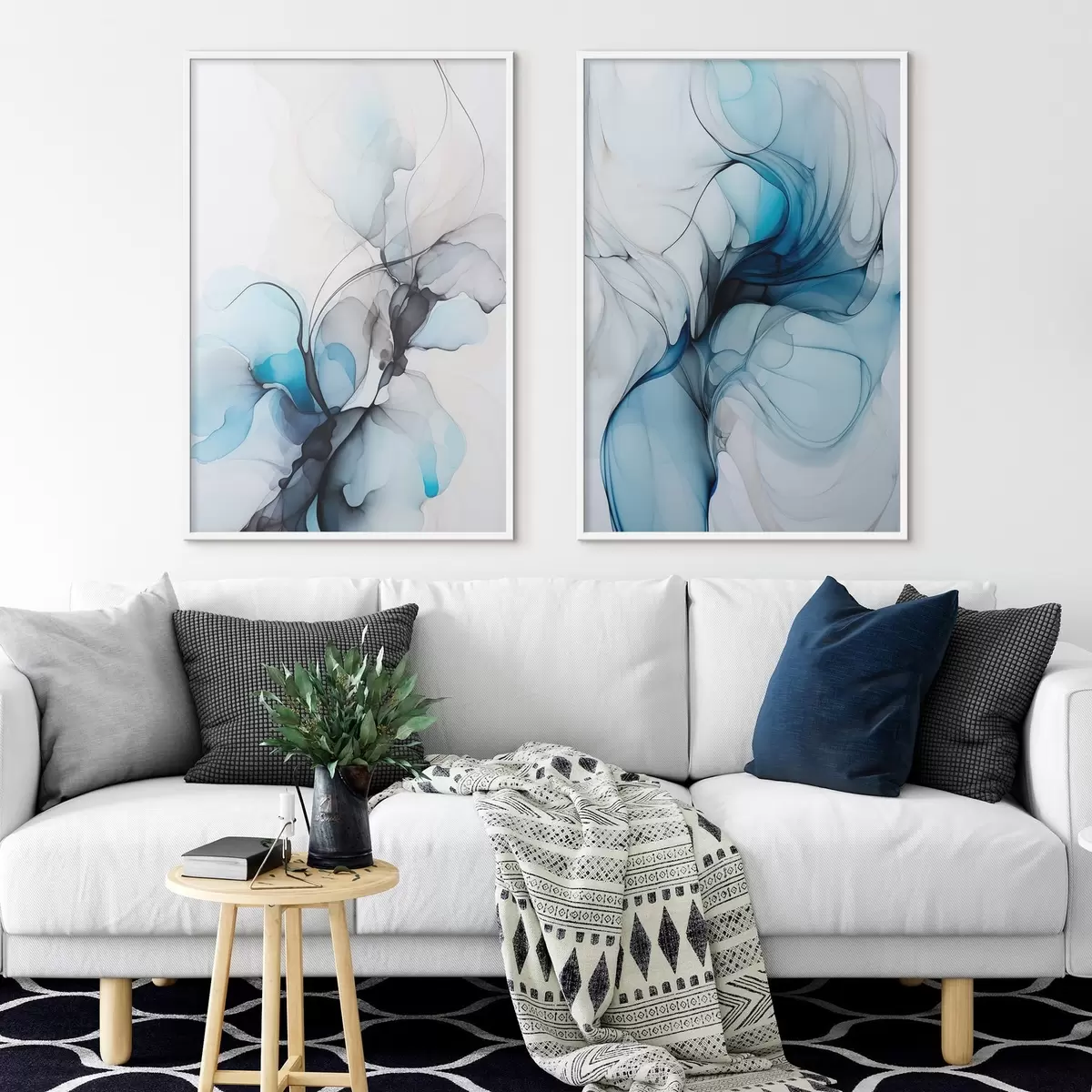 Poster Composition abstraite avec des lignes fluides et des pétales translucides dans les tons bleu blanc et beige, imitation encre à l'alcool Nr d00523