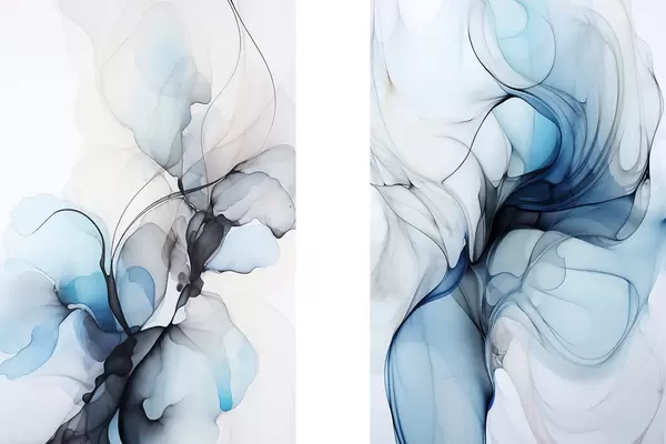 Poster Composition abstraite avec des lignes fluides et des pétales translucides dans les tons bleu blanc et beige, imitation encre à l'alcool d00523