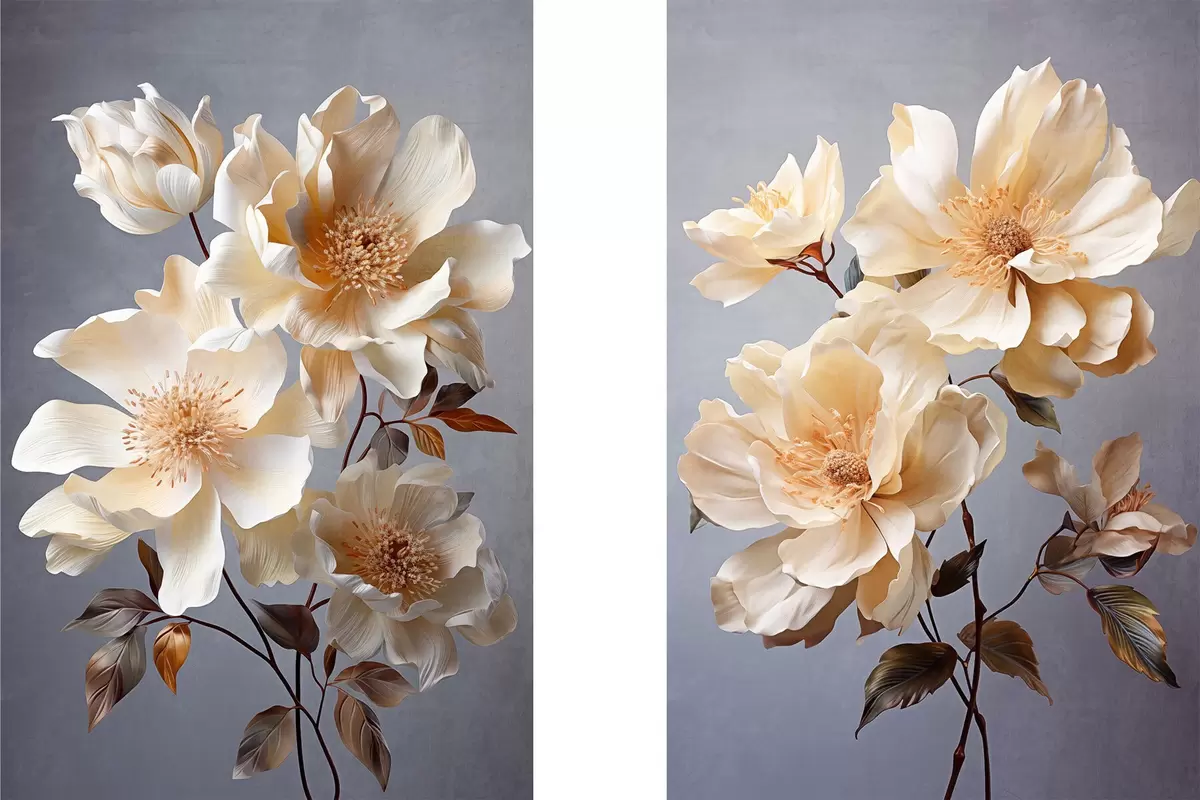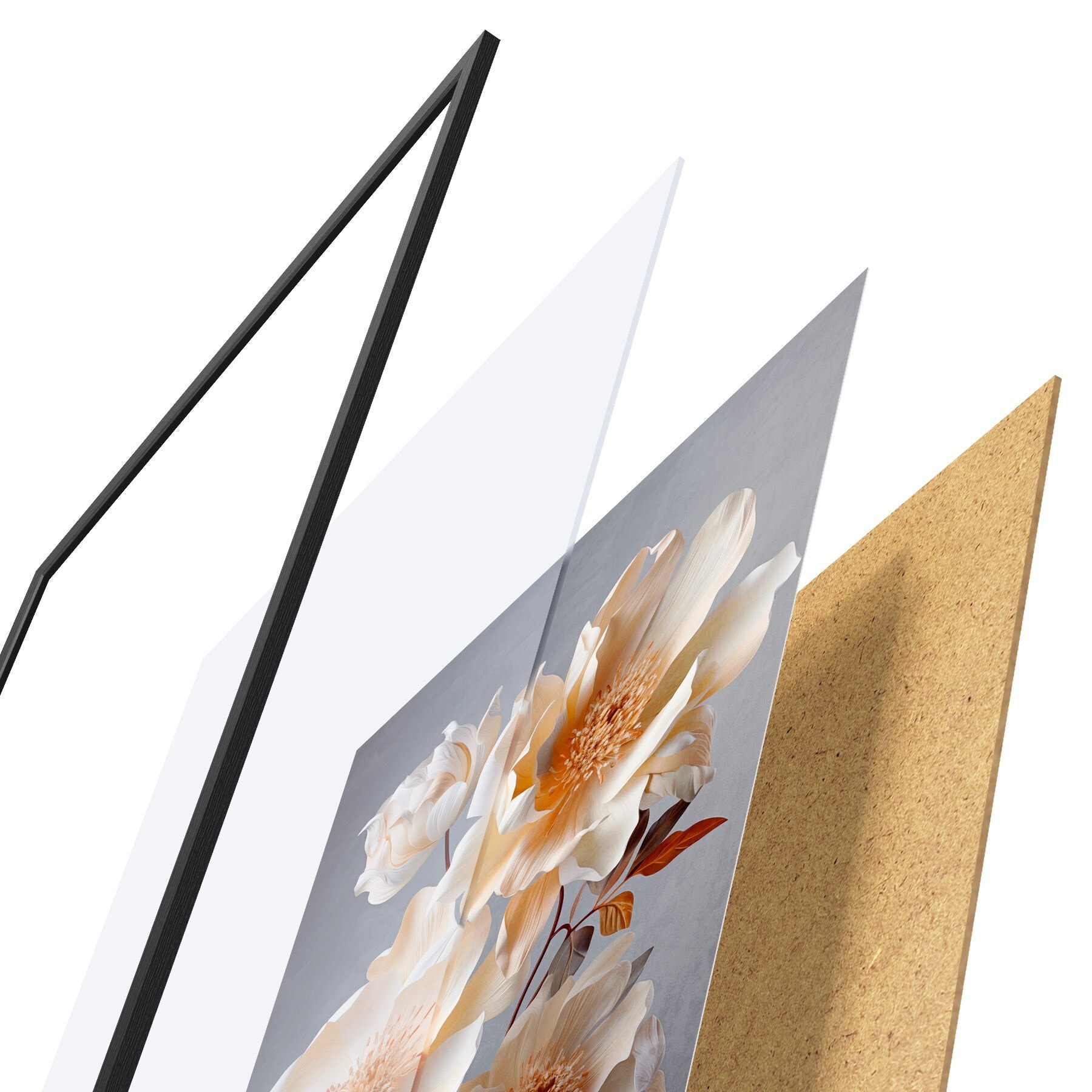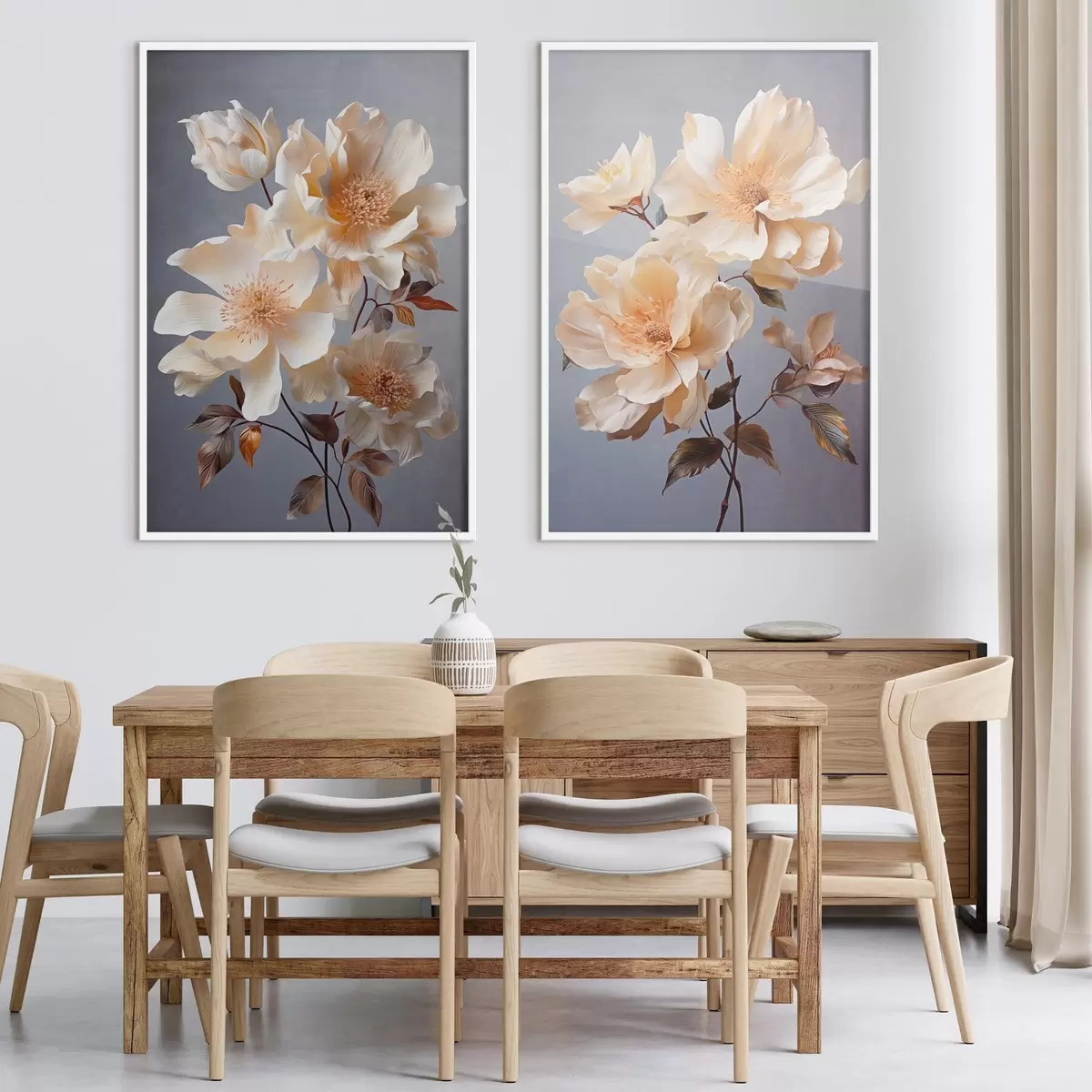 Poster Fleurs texturées avec pistils orange et feuilles orange sur fond gris, lumière douce, élégant, détaillé, réaliste Nr d00525
