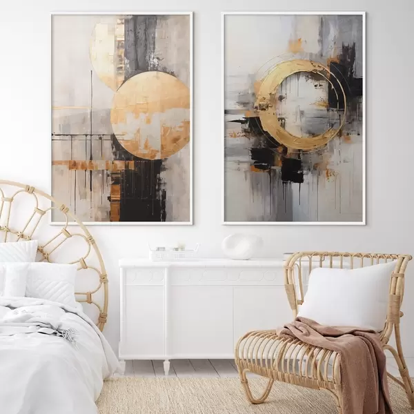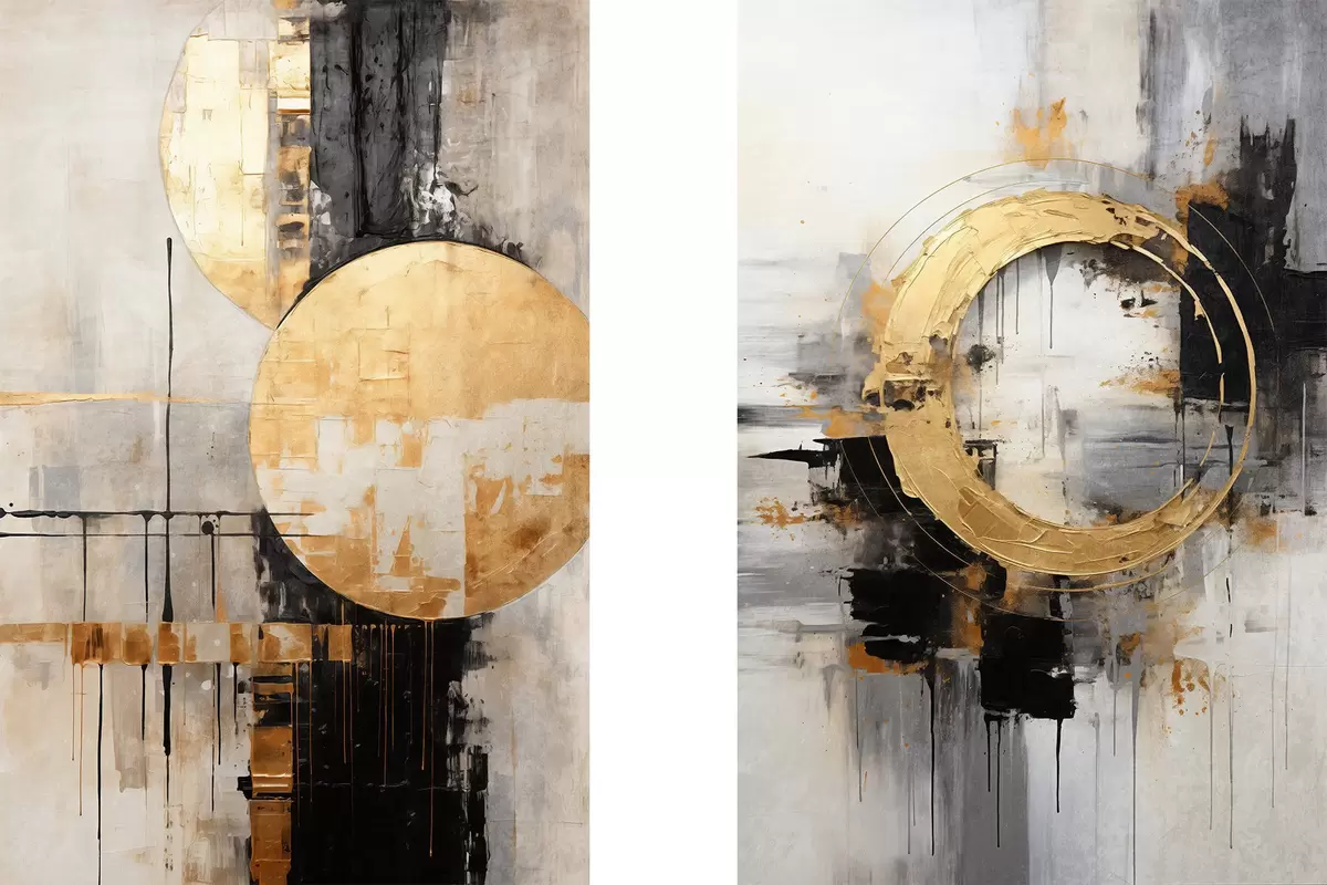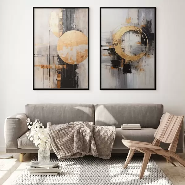 Poster Peinture abstraite avec des cercles, des lignes noires et jaunes, et un arrière-plan dans les tons gris et blancs Nr d00527