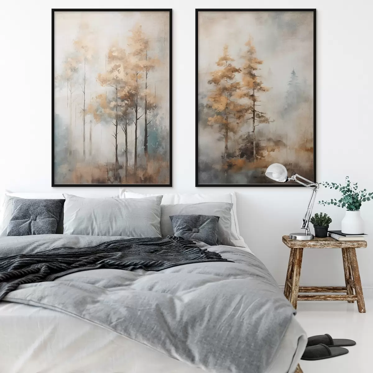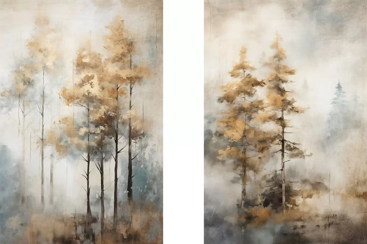 Poster Grands arbres texturés avec des feuilles jaunes dans une forêt, l'arrière-plan est un mélange de tons bleus et bruns doux Nr d00528