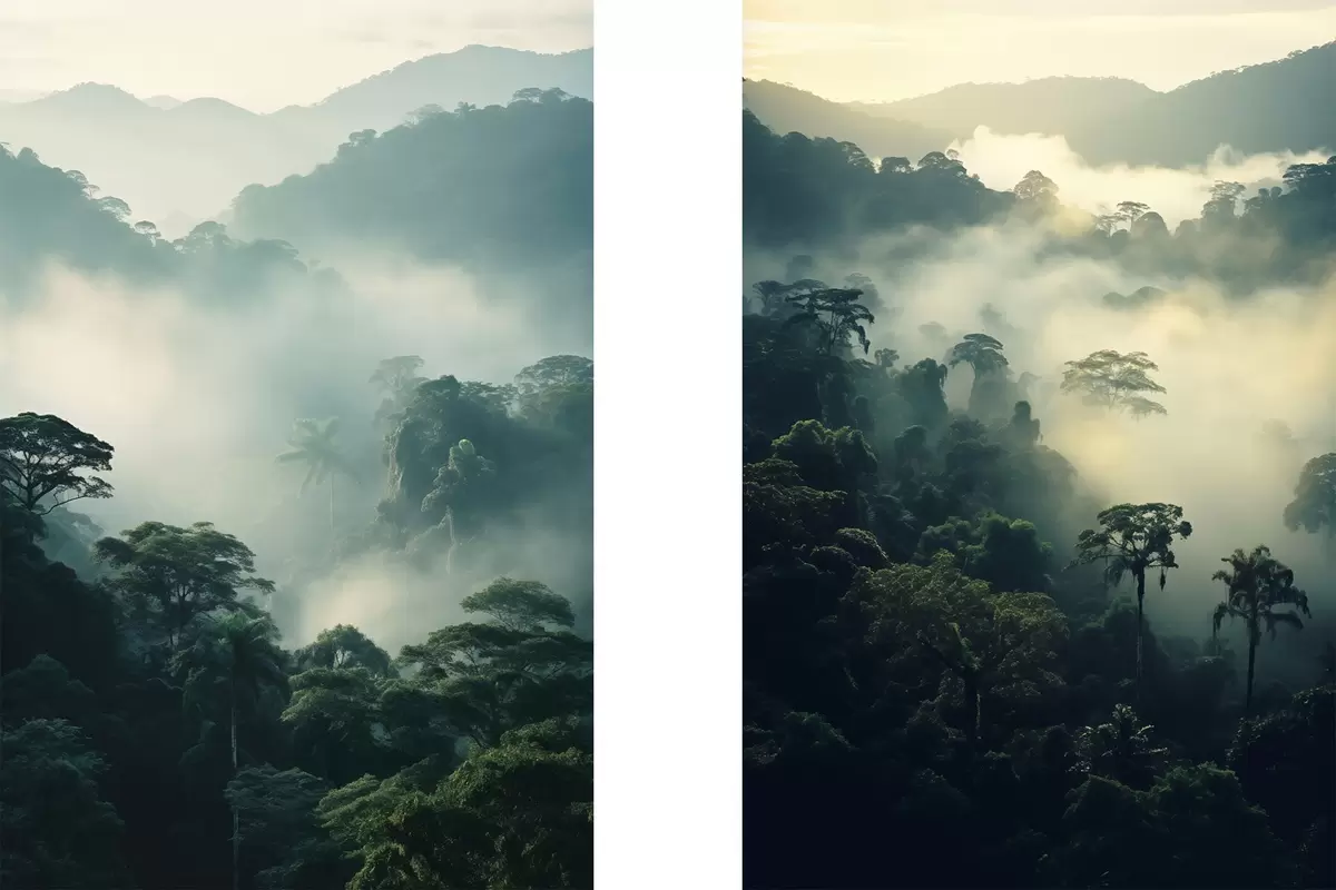 Poster Forêt tropicale avec des arbres verdoyants et une épaisse couche de brume, créant un environnement atmosphérique d00529
