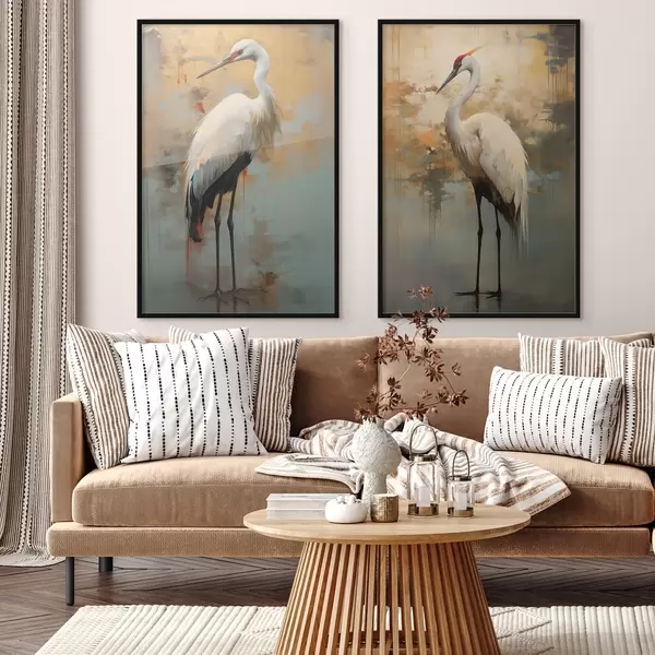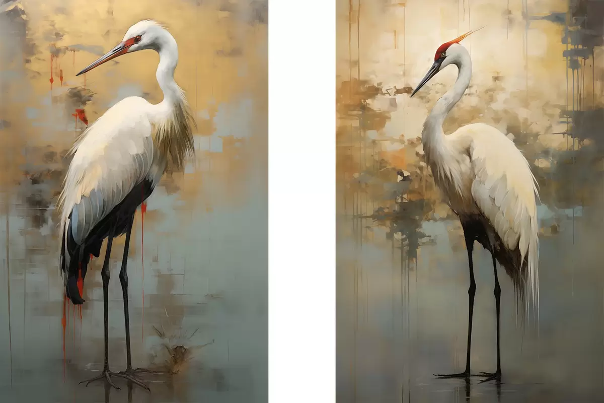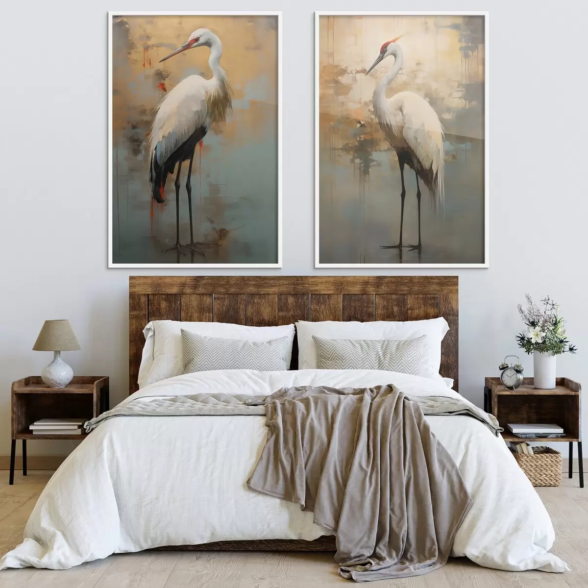 Poster Héron blanc sur fond de teintes jaunes, brunes et bleues atténuées suggérant un paysage brumeux et abstrait Nr d00530