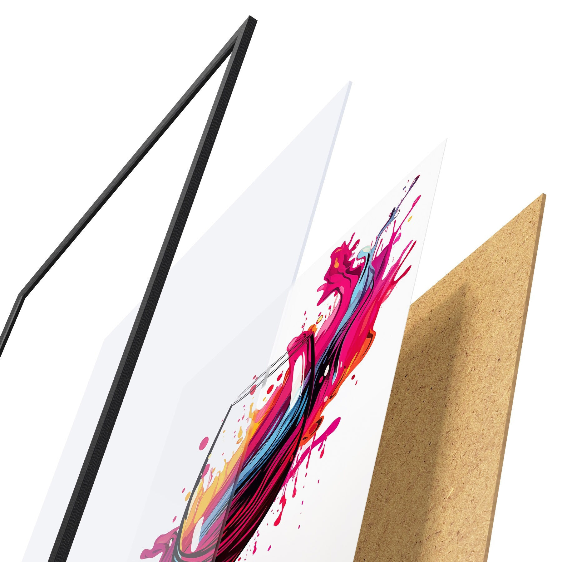 L’affiche encadrée est composée d’un cadre, d’un plexiglas, d’une image imprimée et d’un support en aggloméré. Elle est prête à être accrochée au mur grâce aux fixations situées à l’arrière.