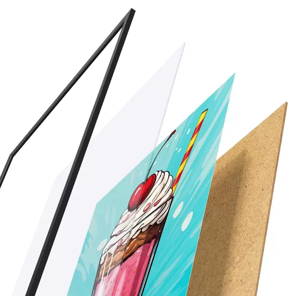 L’affiche encadrée est composée d’un cadre, d’un plexiglas, d’une image imprimée et d’un support en aggloméré. Elle est prête à être accrochée au mur grâce aux fixations situées à l’arrière.