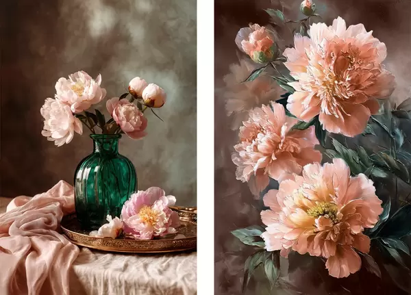 Poster Composition jumelée avec des pivoines roses dans un vase et sur toile d00578