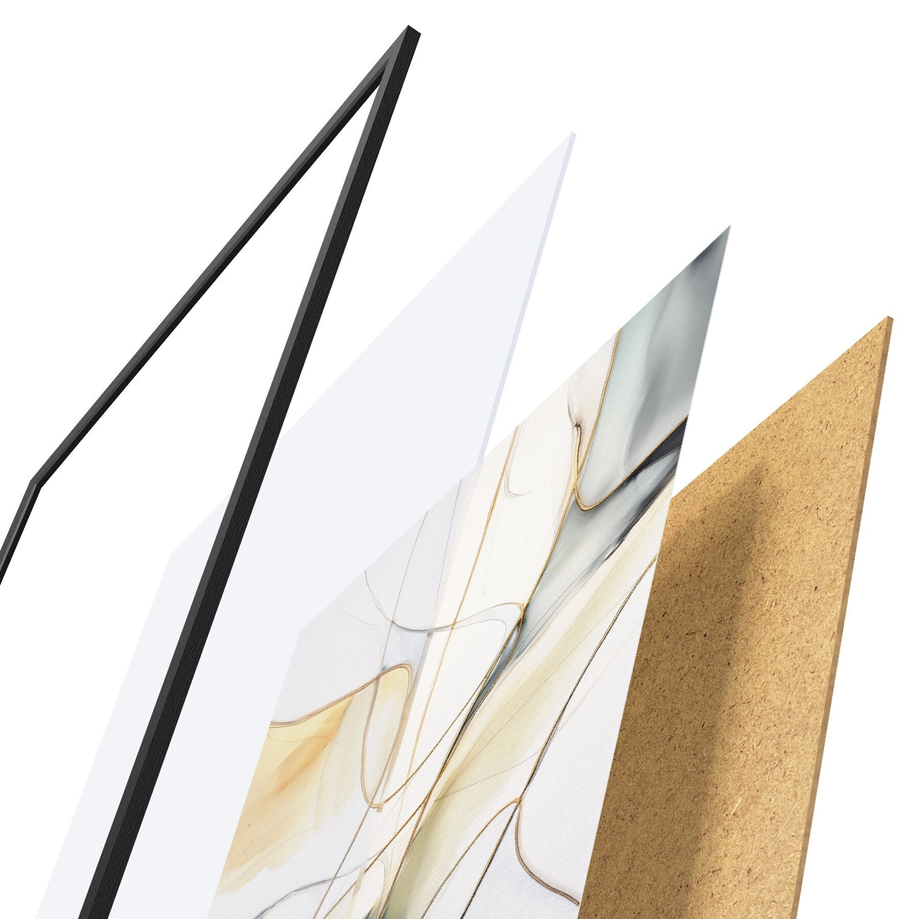 L’affiche encadrée est composée d’un cadre, d’un plexiglas, d’une image imprimée et d’un support en aggloméré. Elle est prête à être accrochée au mur grâce aux fixations situées à l’arrière.