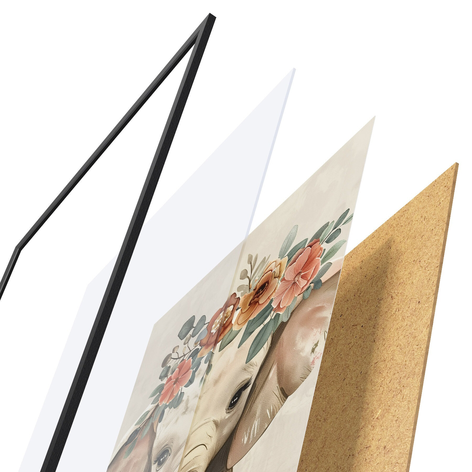 L’affiche encadrée est composée d’un cadre, d’un plexiglas, d’une image imprimée et d’un support en aggloméré. Elle est prête à être accrochée au mur grâce aux fixations situées à l’arrière.