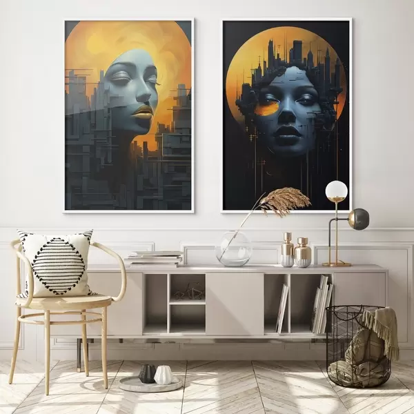 Poster Portrait d'une jeune fille sur fond de ville abstraite Nr d00618