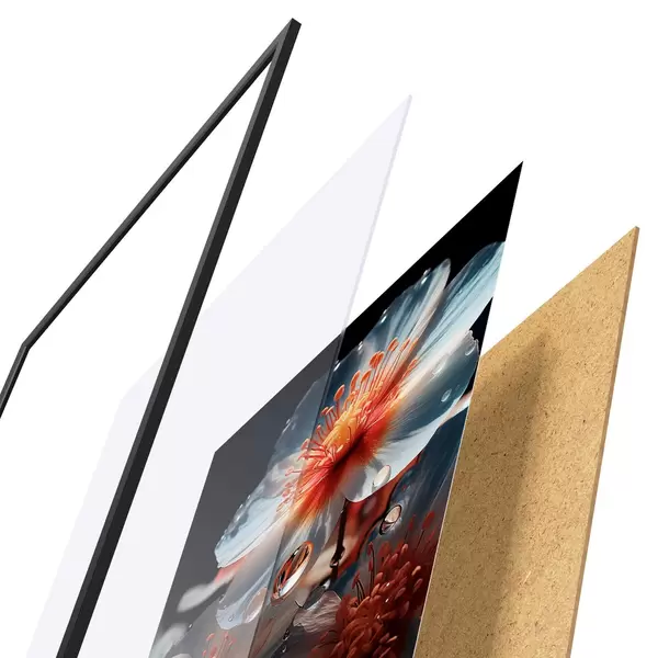 L’affiche encadrée est composée d’un cadre, d’un plexiglas, d’une image imprimée et d’un support en aggloméré. Elle est prête à être accrochée au mur grâce aux fixations situées à l’arrière.