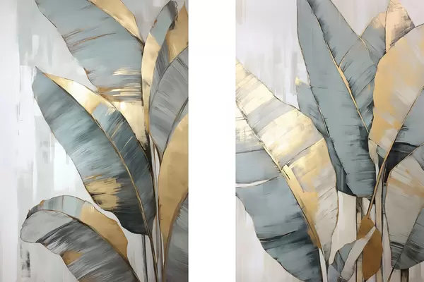 Poster Un ensemble de feuilles de bananier bleues, grises et jaunes avec des coups de pinceau visibles, sur un fond blanc abstrait Nr d00645