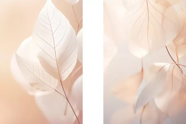 Poster Gros plan sur des feuilles translucides aux nervures délicates, palette de couleurs pêche et blanc, arrière-plan flou Nr d00647