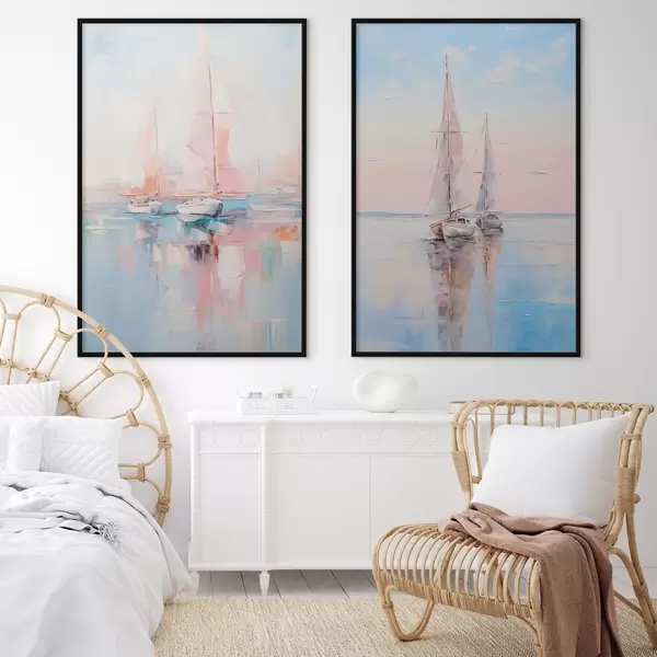 Poster Voiliers aux voiles roses flottant sur une mer calme, reflets des bateaux dans l'eau, couleurs douces et pastel Nr d00648