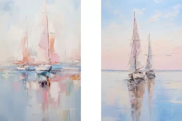 Poster Voiliers aux voiles roses flottant sur une mer calme, reflets des bateaux dans l'eau, couleurs douces et pastel Nr d00648