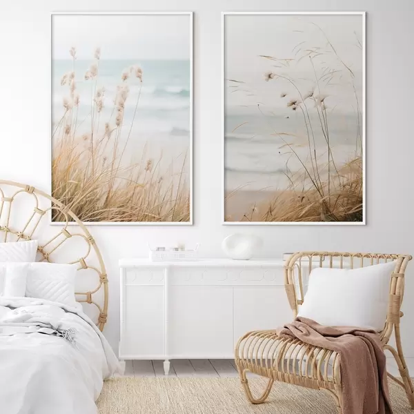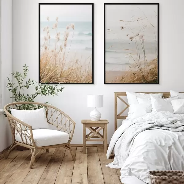 Poster Herbe haute avec des têtes de graines duveteuses, plage de sable et vagues de l'océan en arrière-plan, palette de couleurs douces et sourdes d00650