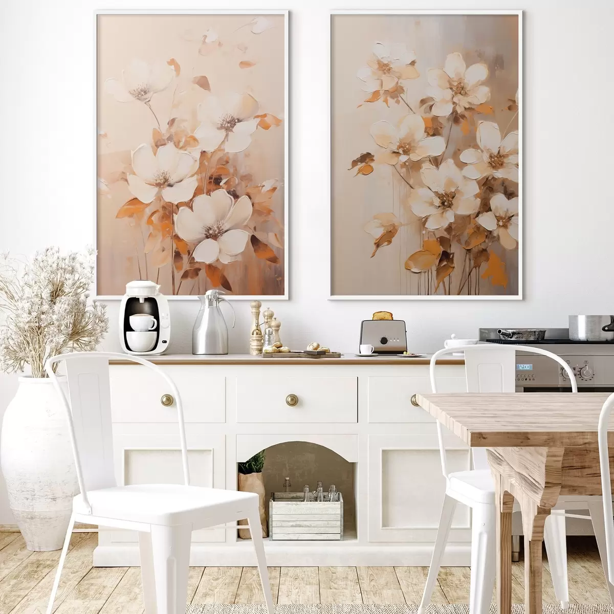Poster Fleurs blanches avec feuilles orange, coups de pinceau délicats, palette de couleurs chaudes, composition élégante Nr d00656