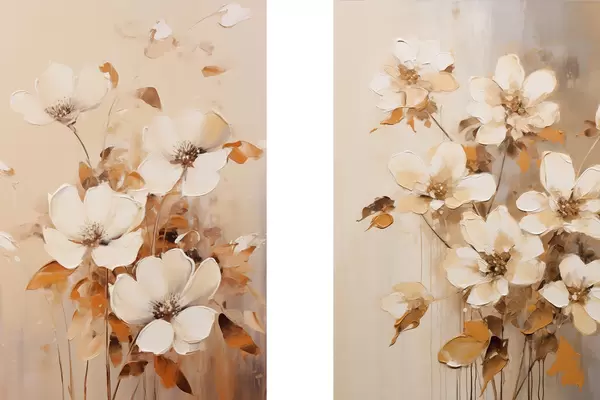 Poster Fleurs blanches avec feuilles orange, coups de pinceau délicats, palette de couleurs chaudes, composition élégante Nr d00656