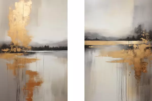 Poster Un paysage abstrait avec un lac, un arbre et un brouillard jaune, l'eau se reflète et le ciel est nuageux Nr d00657