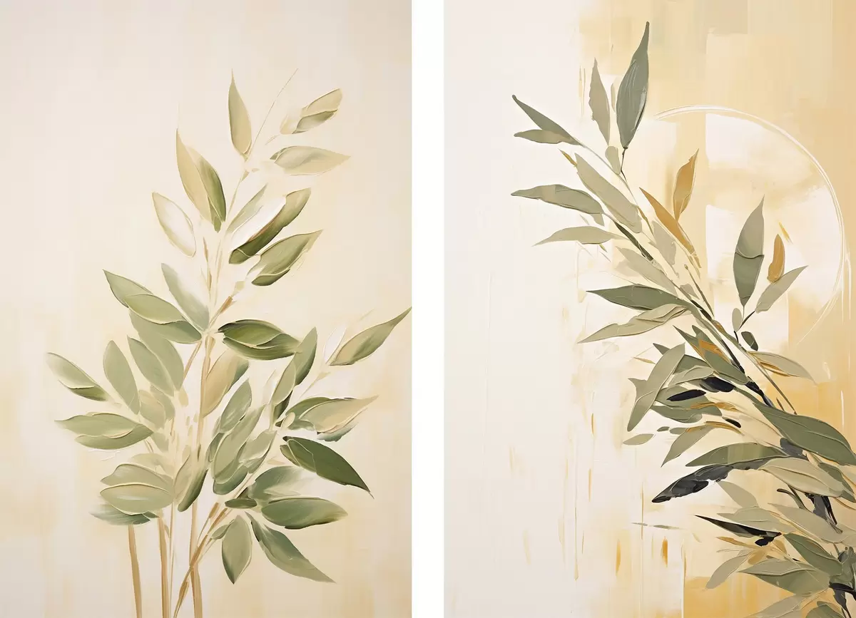 Poster Branche botanique avec des feuilles vertes sur un fond chaud Nr d00686