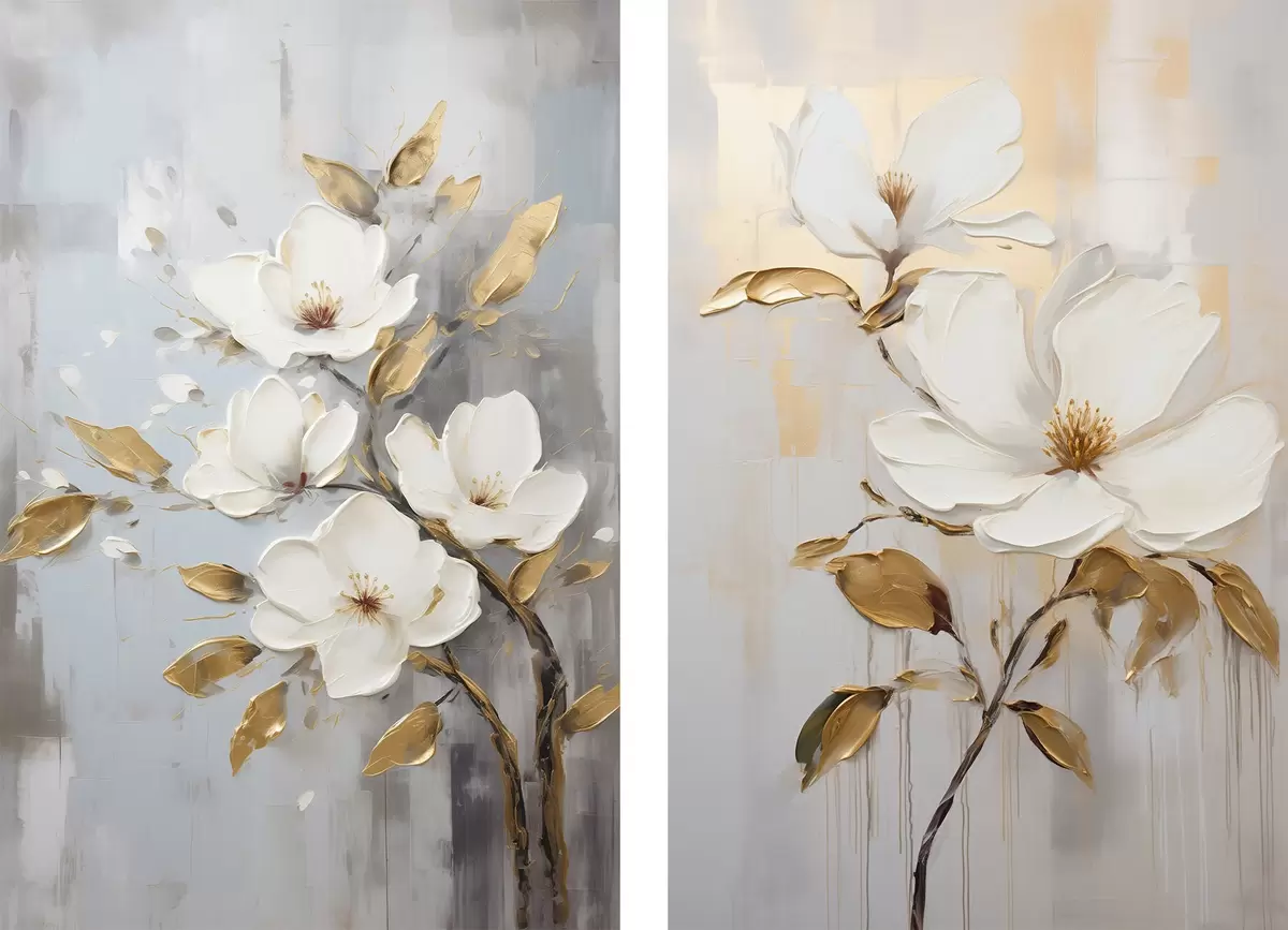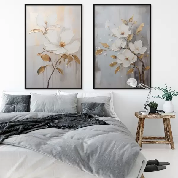 Poster Deux fleurs blanches avec des feuilles jaune-orange sur un fond clair Nr d00687