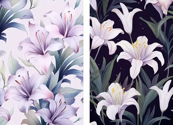 Poster Lys roses délicats avec feuilles vertes sur fond clair et foncé Nr d00689