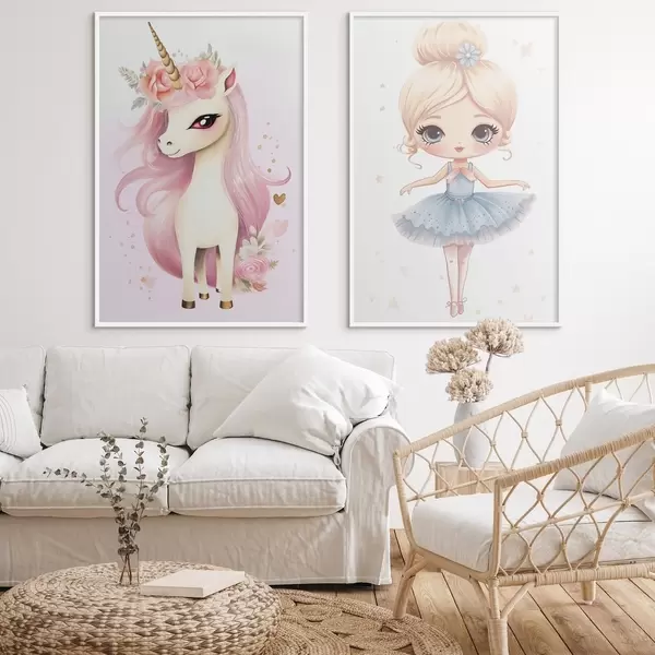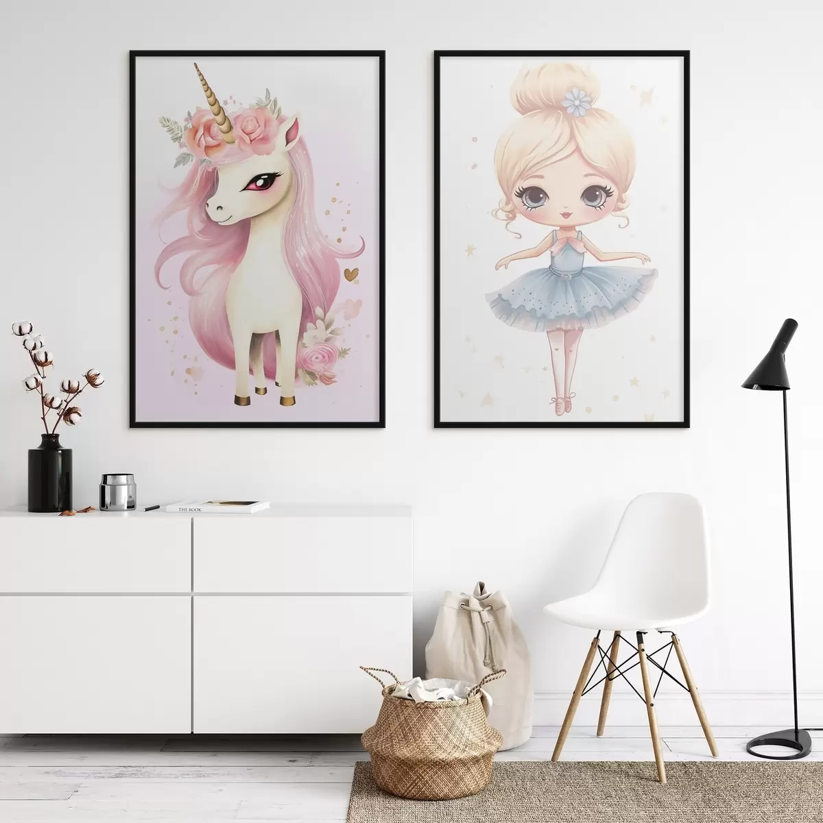 Poster Poupée ballerine en robe bleue et licorne à la crinière rose d00692