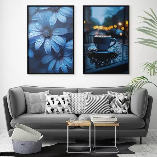 Poster Fleurs bleues avec gouttes d'eau et tasse de café sous la pluie Nr d00694