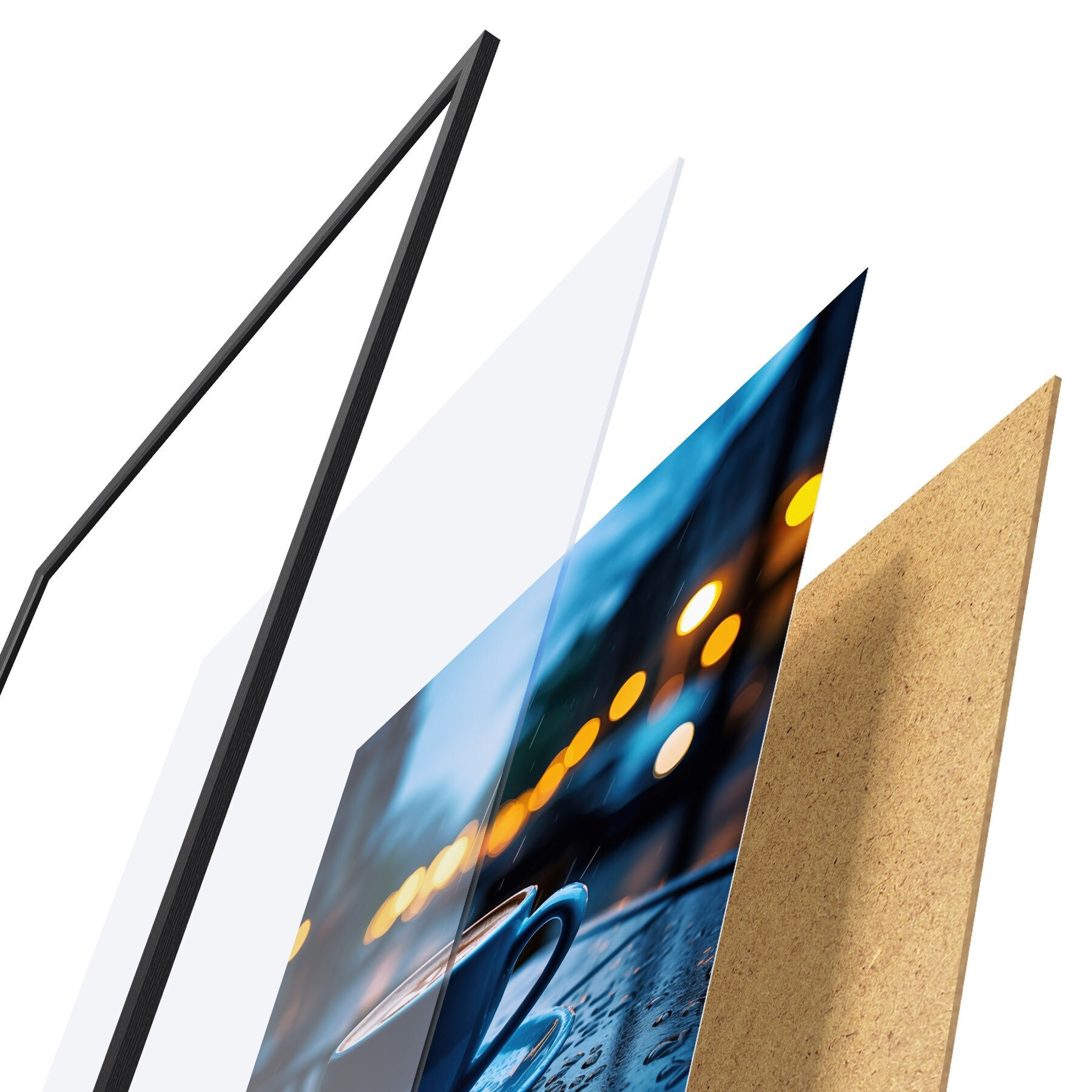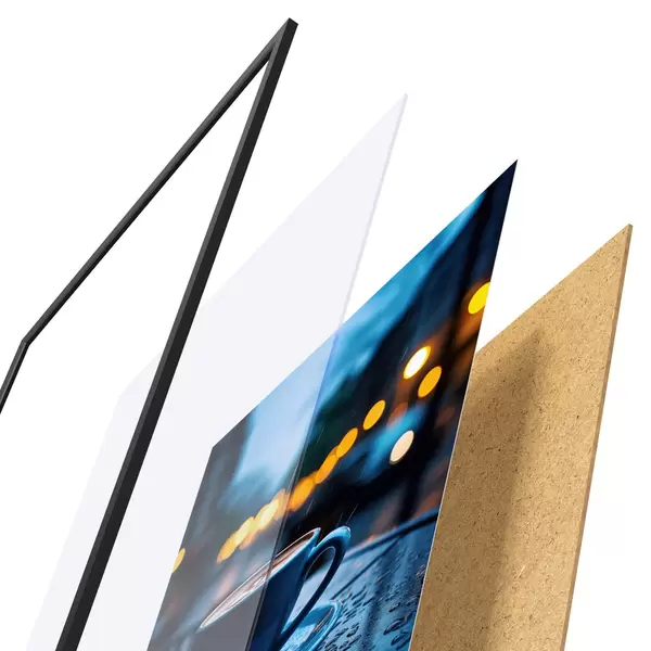L’affiche encadrée est composée d’un cadre, d’un plexiglas, d’une image imprimée et d’un support en aggloméré. Elle est prête à être accrochée au mur grâce aux fixations situées à l’arrière.