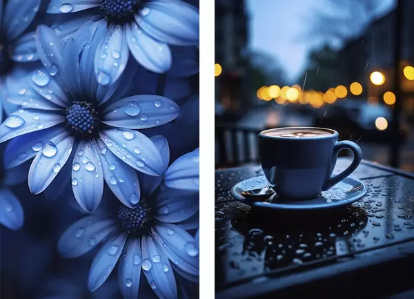 Poster Fleurs bleues avec gouttes d'eau et tasse de café sous la pluie Nr d00694
