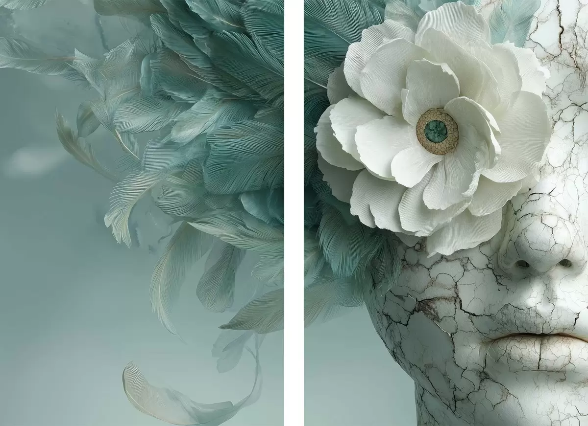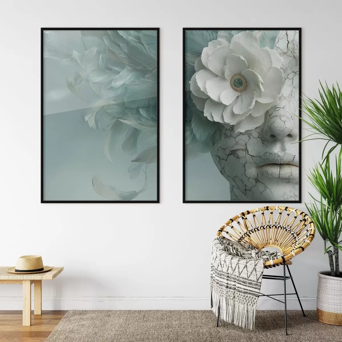 Poster visage en marbre d'une fille avec une fleur et des plumes Nr d00699