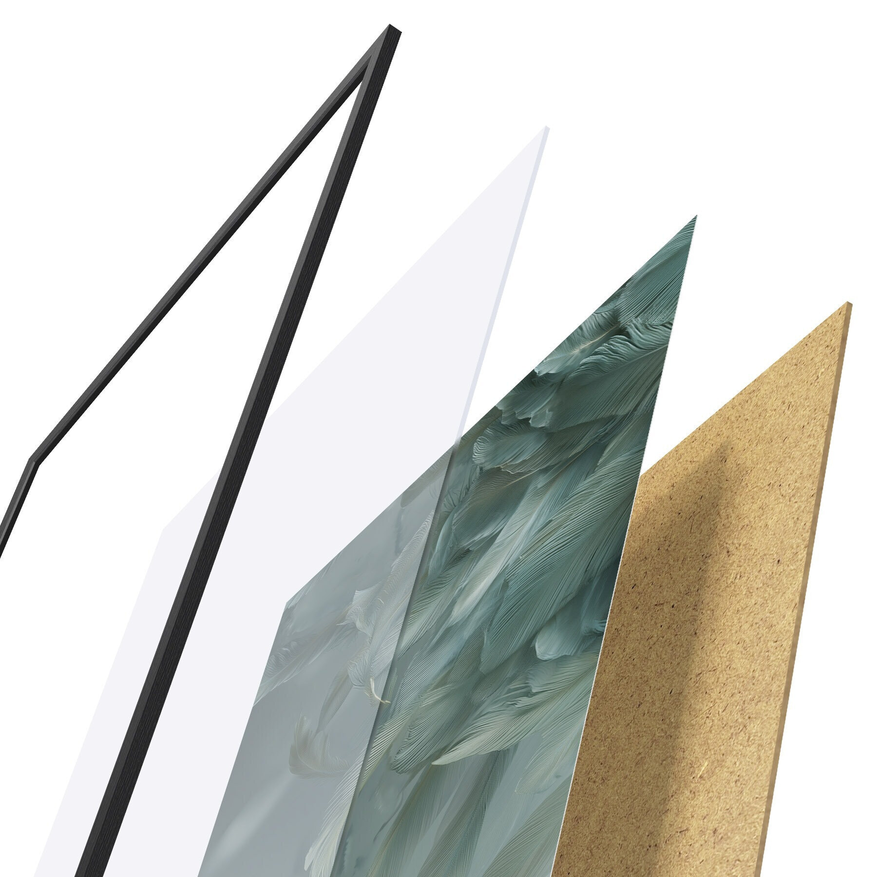 L’affiche encadrée est composée d’un cadre, d’un plexiglas, d’une image imprimée et d’un support en aggloméré. Elle est prête à être accrochée au mur grâce aux fixations situées à l’arrière.