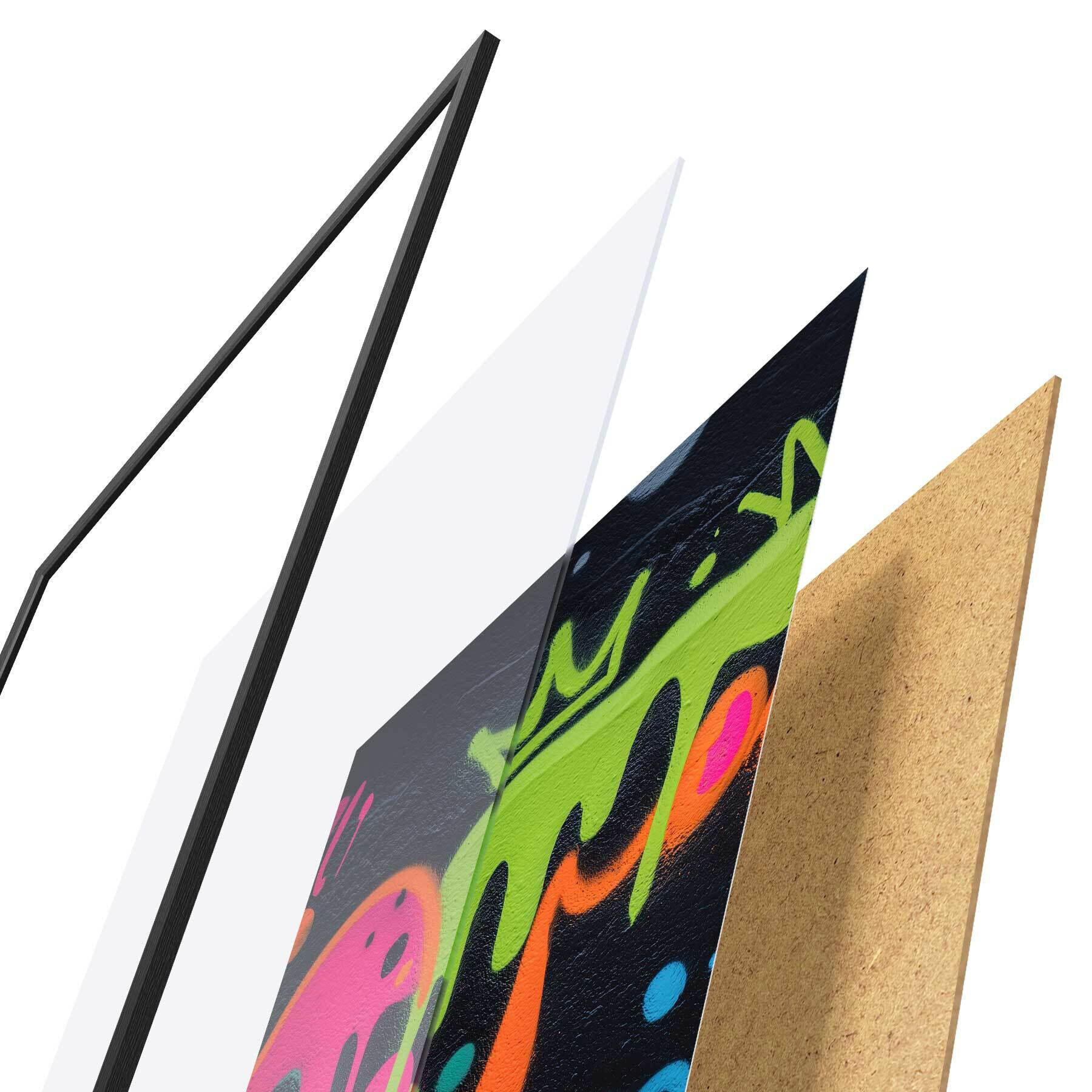 L’affiche encadrée est composée d’un cadre, d’un plexiglas, d’une image imprimée et d’un support en aggloméré. Elle est prête à être accrochée au mur grâce aux fixations situées à l’arrière.