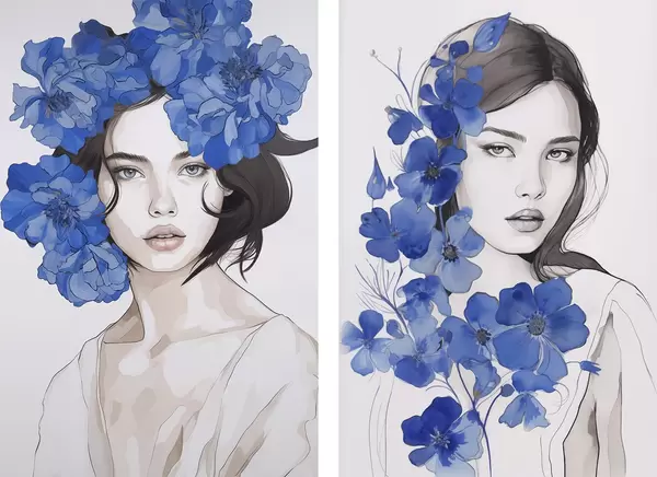 Poster Portrait d'une jeune fille avec des fleurs bleues d00721