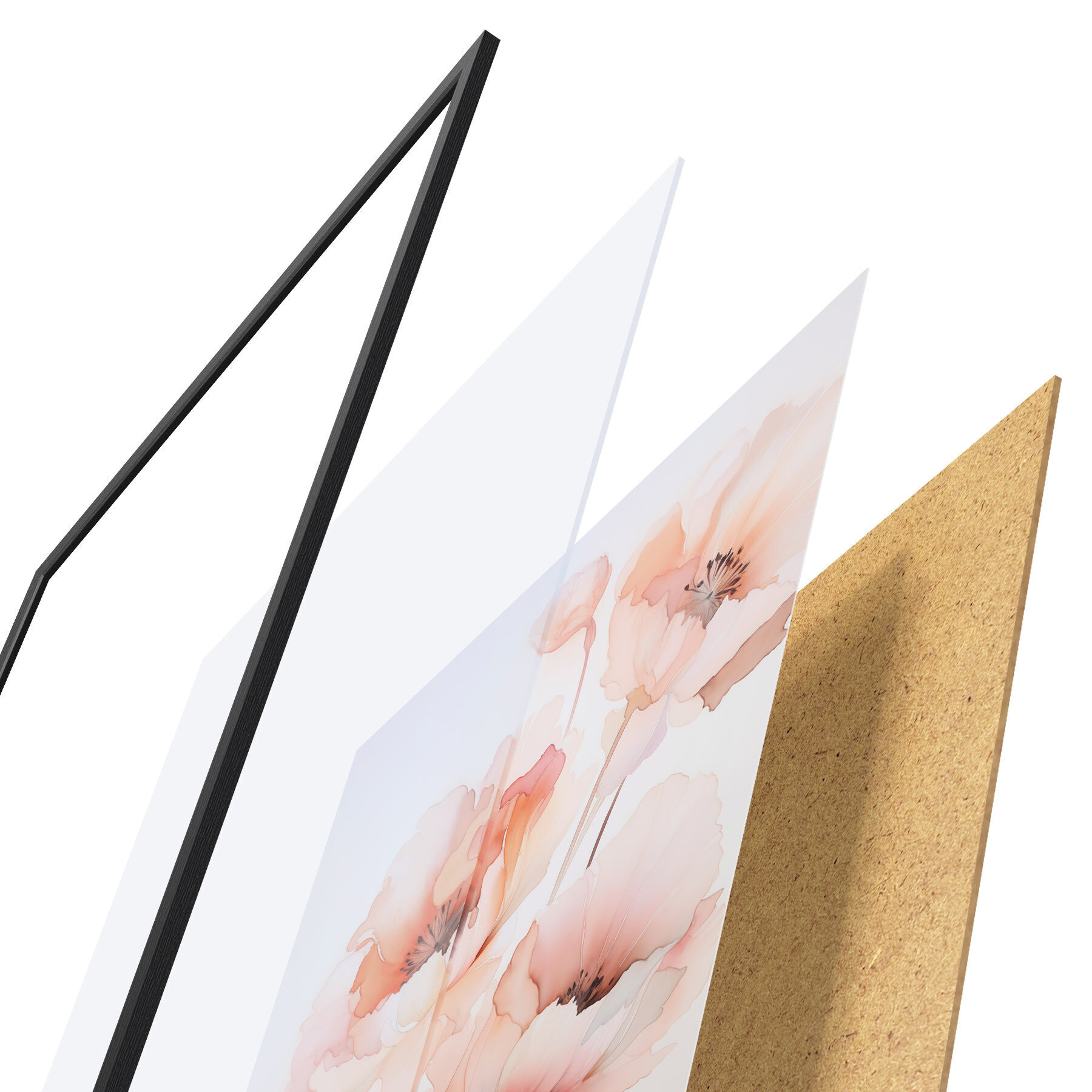 L’affiche encadrée est composée d’un cadre, d’un plexiglas, d’une image imprimée et d’un support en aggloméré. Elle est prête à être accrochée au mur grâce aux fixations situées à l’arrière.