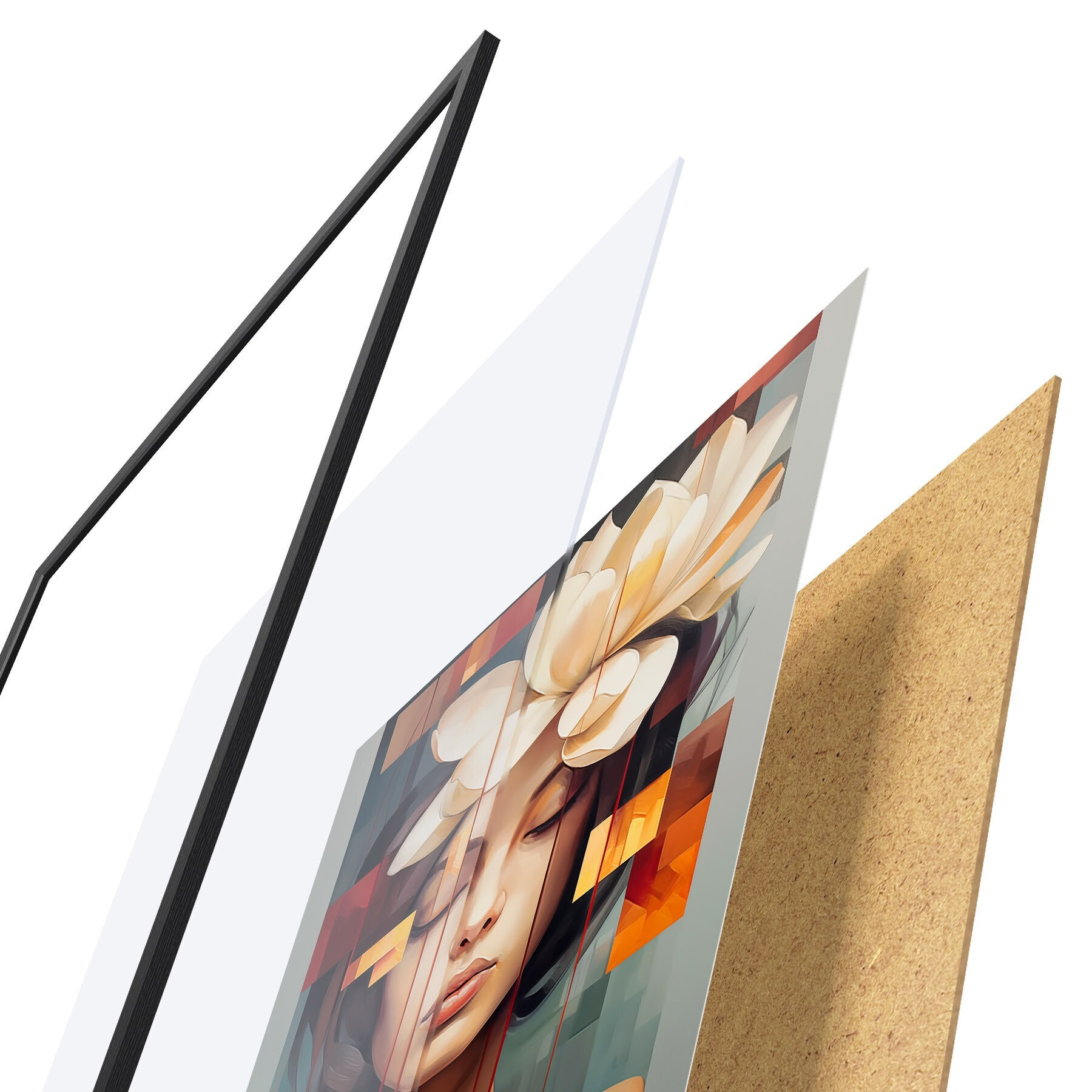 L’affiche encadrée est composée d’un cadre, d’un plexiglas, d’une image imprimée et d’un support en aggloméré. Elle est prête à être accrochée au mur grâce aux fixations situées à l’arrière.