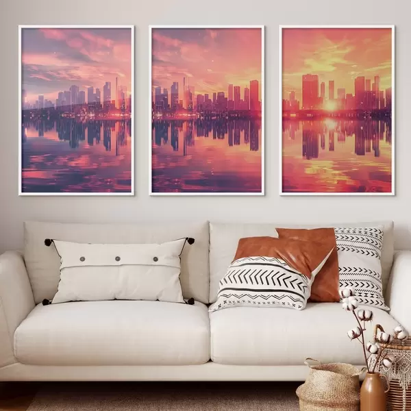Poster Coucher de soleil romantique avec une ville moderne en arrière-plan Nr d00784