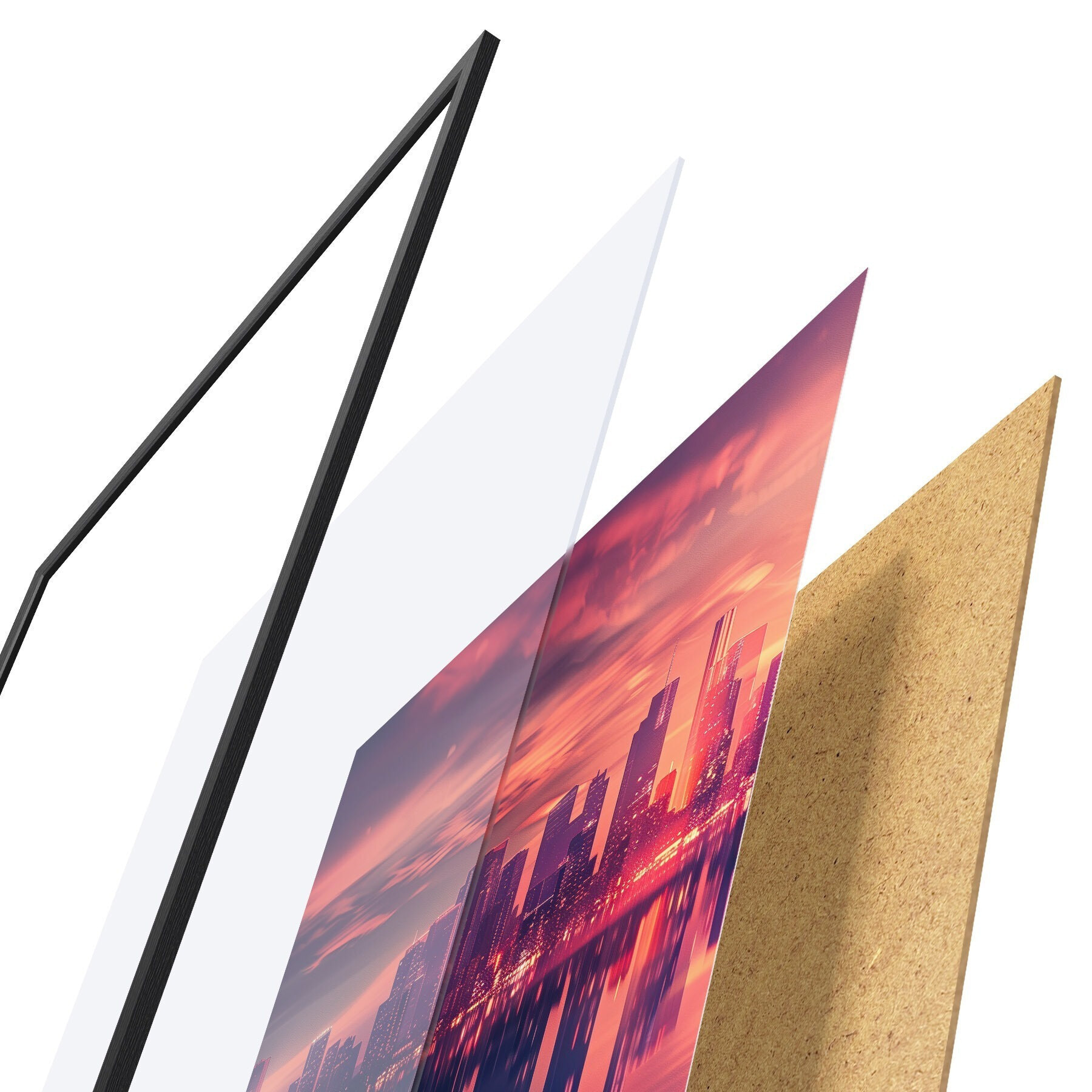 L’affiche encadrée est composée d’un cadre, d’un plexiglas, d’une image imprimée et d’un support en aggloméré. Elle est prête à être accrochée au mur grâce aux fixations situées à l’arrière.
