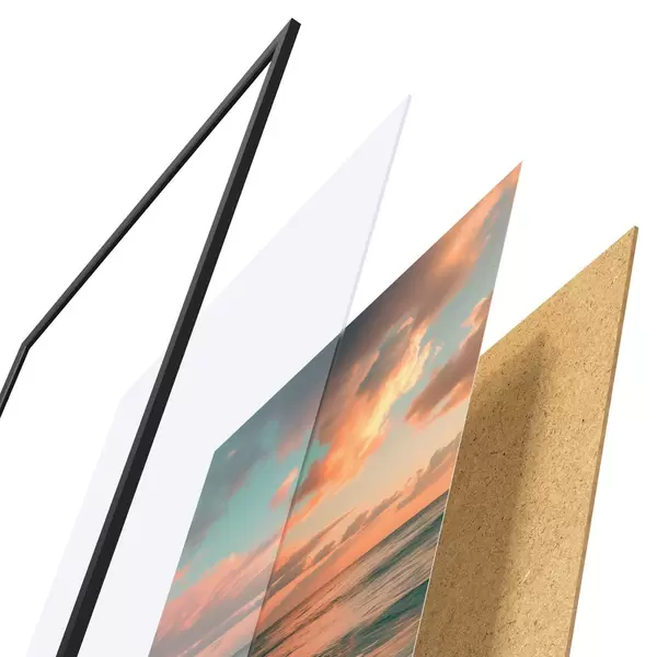 L’affiche encadrée est composée d’un cadre, d’un plexiglas, d’une image imprimée et d’un support en aggloméré. Elle est prête à être accrochée au mur grâce aux fixations situées à l’arrière.