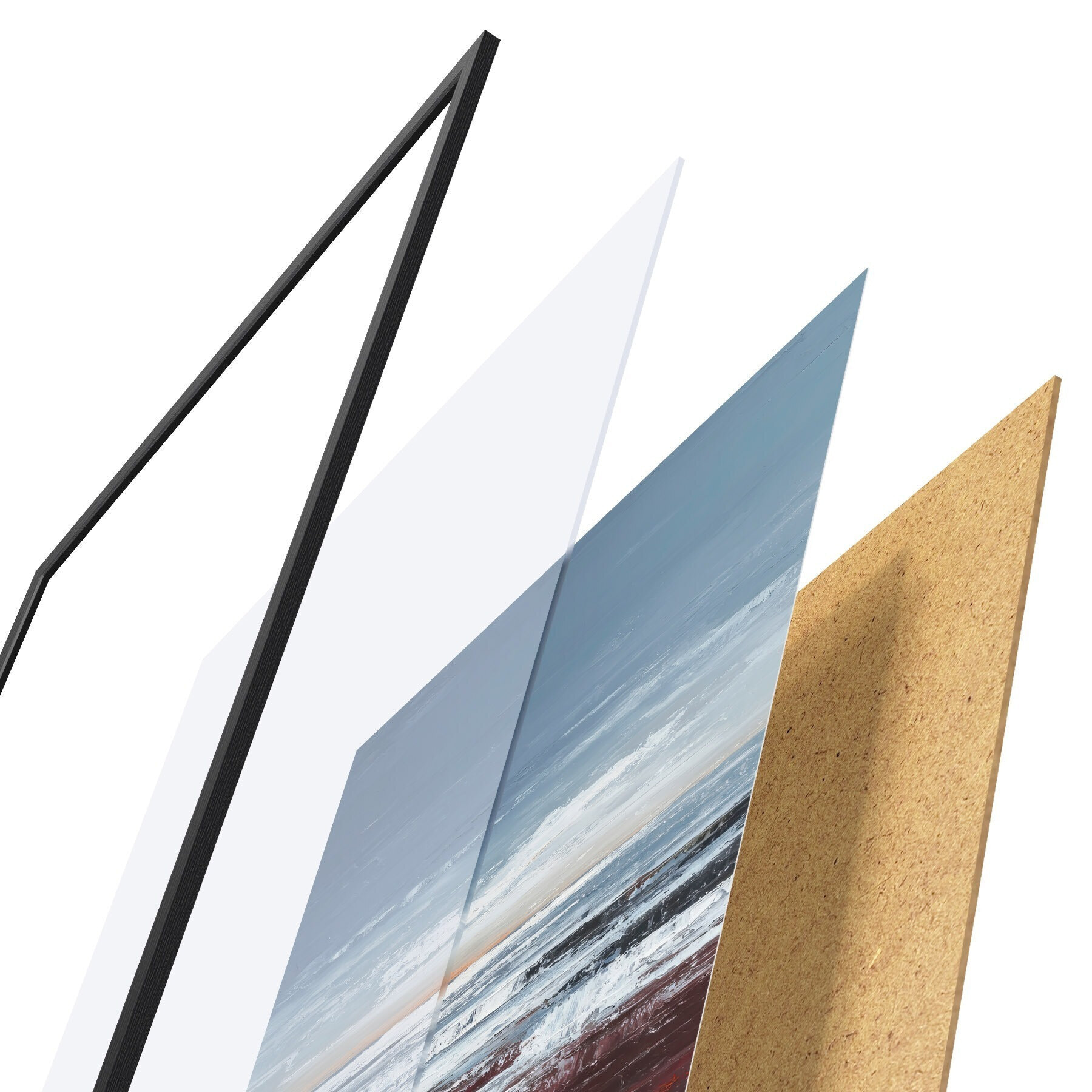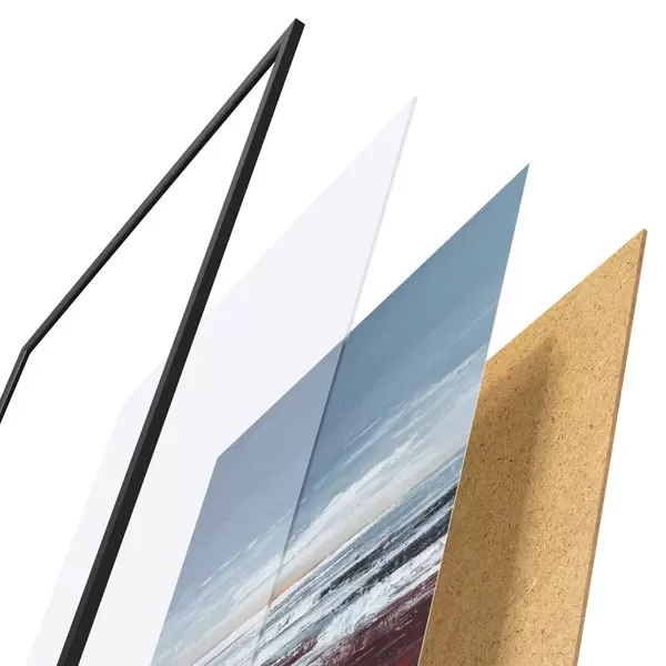 L’affiche encadrée est composée d’un cadre, d’un plexiglas, d’une image imprimée et d’un support en aggloméré. Elle est prête à être accrochée au mur grâce aux fixations situées à l’arrière.