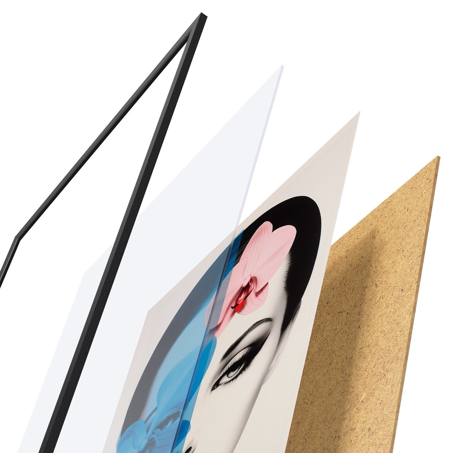L’affiche encadrée est composée d’un cadre, d’un plexiglas, d’une image imprimée et d’un support en aggloméré. Elle est prête à être accrochée au mur grâce aux fixations situées à l’arrière.
