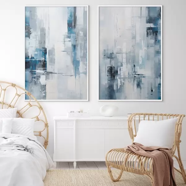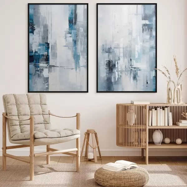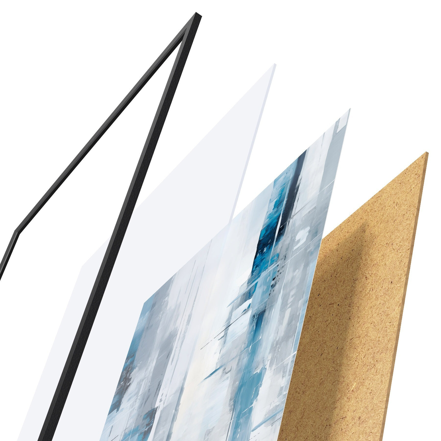 Poster Imitation de peinture abstraite avec des couleurs bleues, grises et blanches, des lignes verticales et des formes géométriques Nr d00819