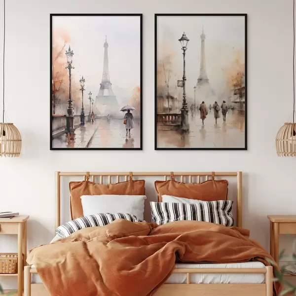 Poster Une journée pluvieuse d'automne à Paris avec la Tour Eiffel en arrière-plan et des lampadaires vintage d00821