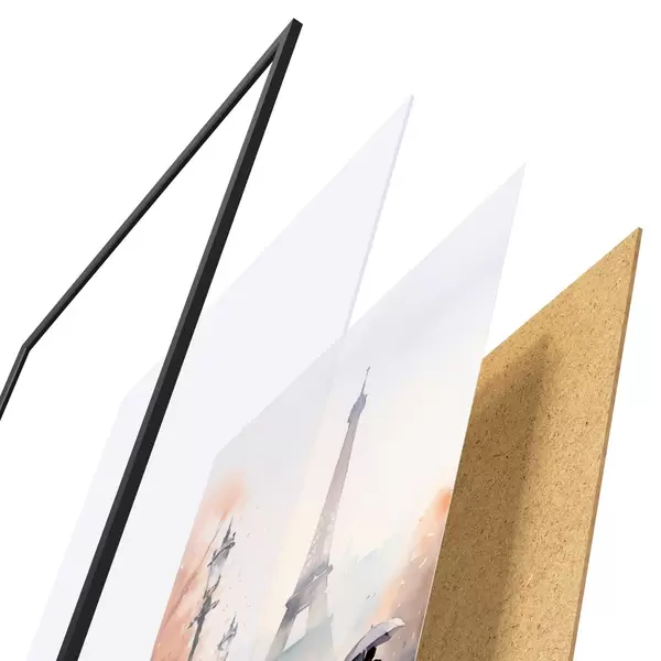 L’affiche encadrée est composée d’un cadre, d’un plexiglas, d’une image imprimée et d’un support en aggloméré. Elle est prête à être accrochée au mur grâce aux fixations situées à l’arrière.