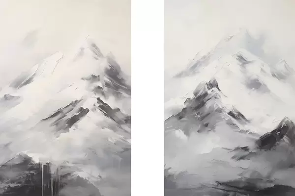 Poster Sommets enneigés avec des ombres grises, ciel gris, coups de pinceau, texturé, minimaliste d00822