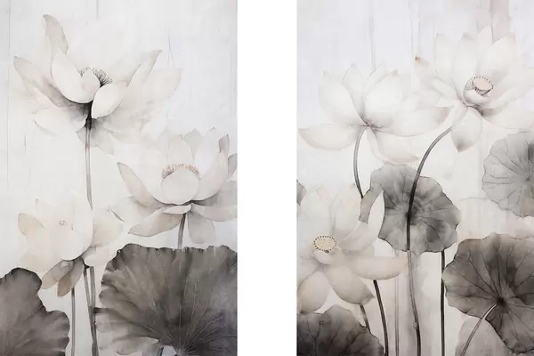 Poster Fleurs de lotus blanches texturées avec des feuilles foncées, fond clair, design minimaliste Nr d00824