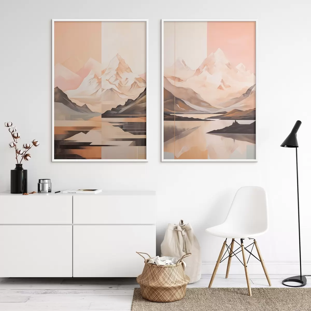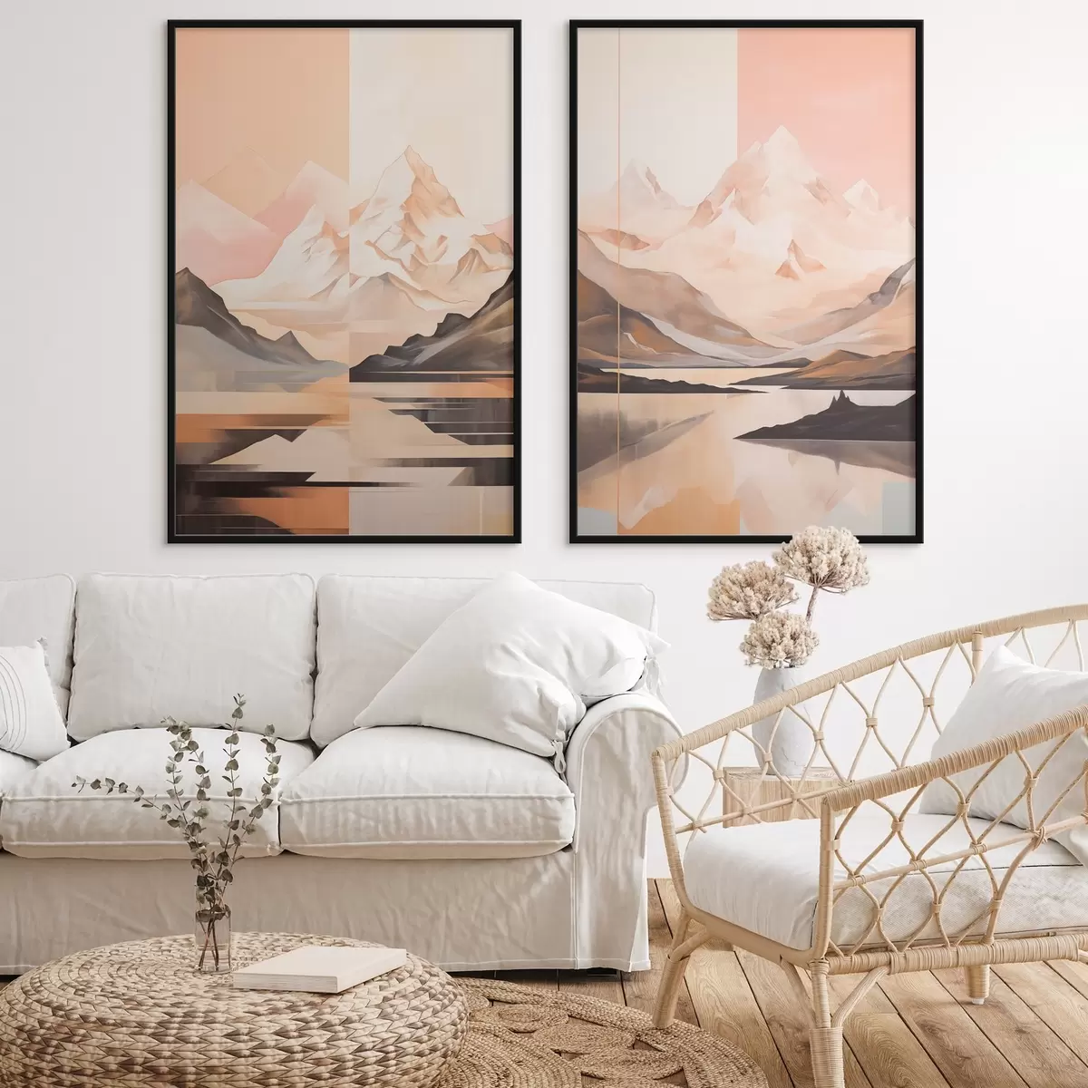 Poster Paysage abstrait avec des montagnes et un lac, couleurs pastel, style minimaliste d00830