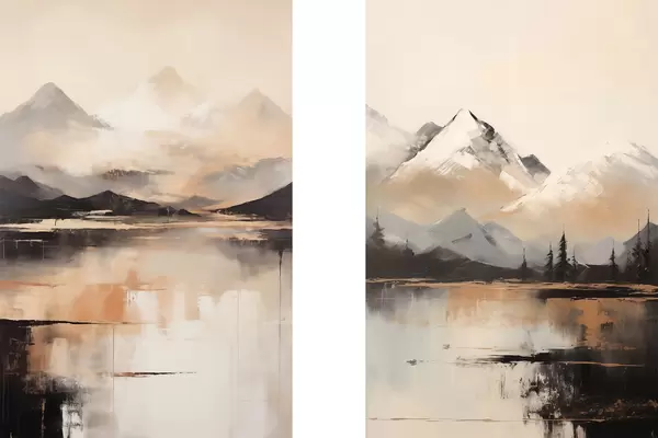 Poster Une peinture imitant un paysage texturé représentant des montagnes et un lac Nr d00831