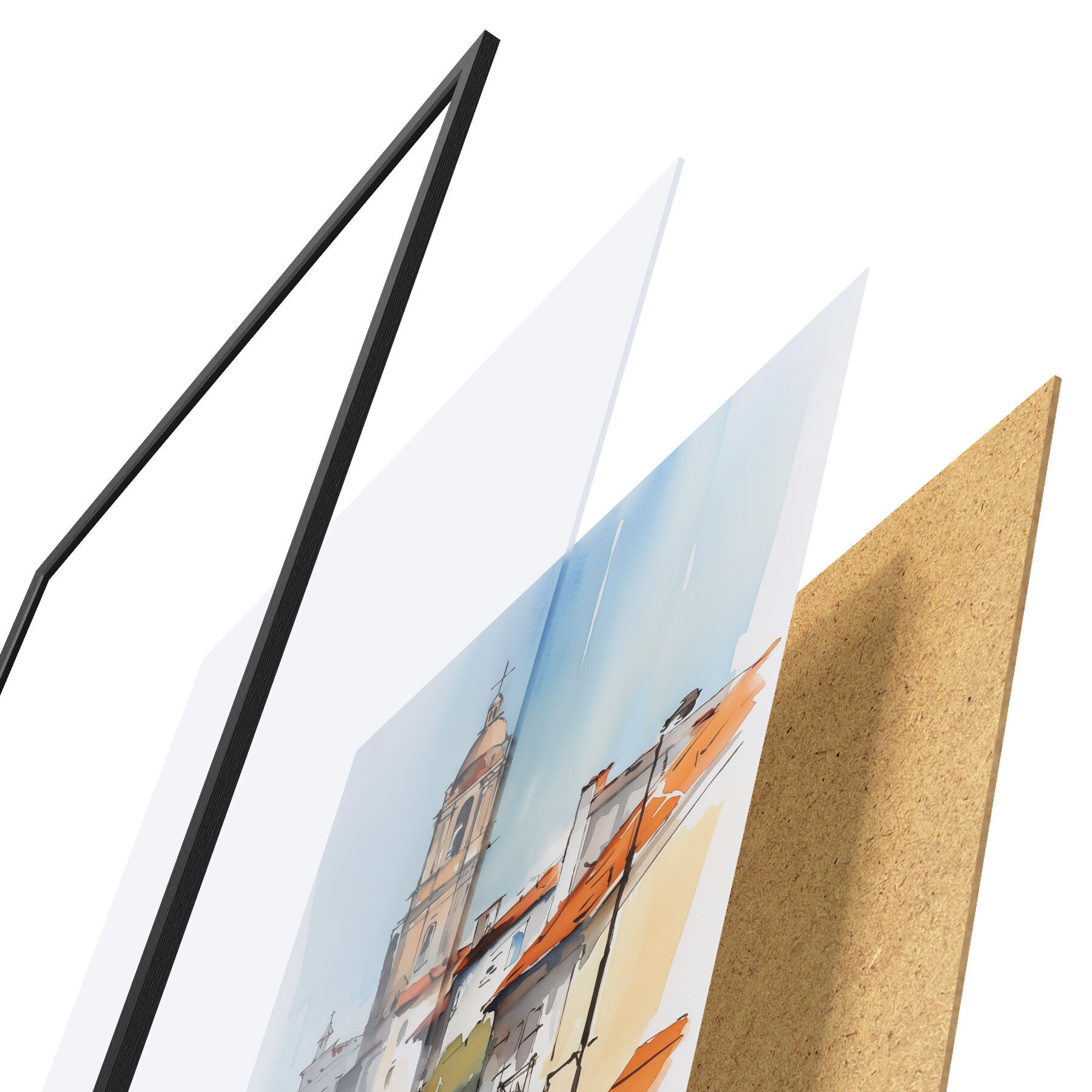 L’affiche encadrée est composée d’un cadre, d’un plexiglas, d’une image imprimée et d’un support en aggloméré. Elle est prête à être accrochée au mur grâce aux fixations situées à l’arrière.